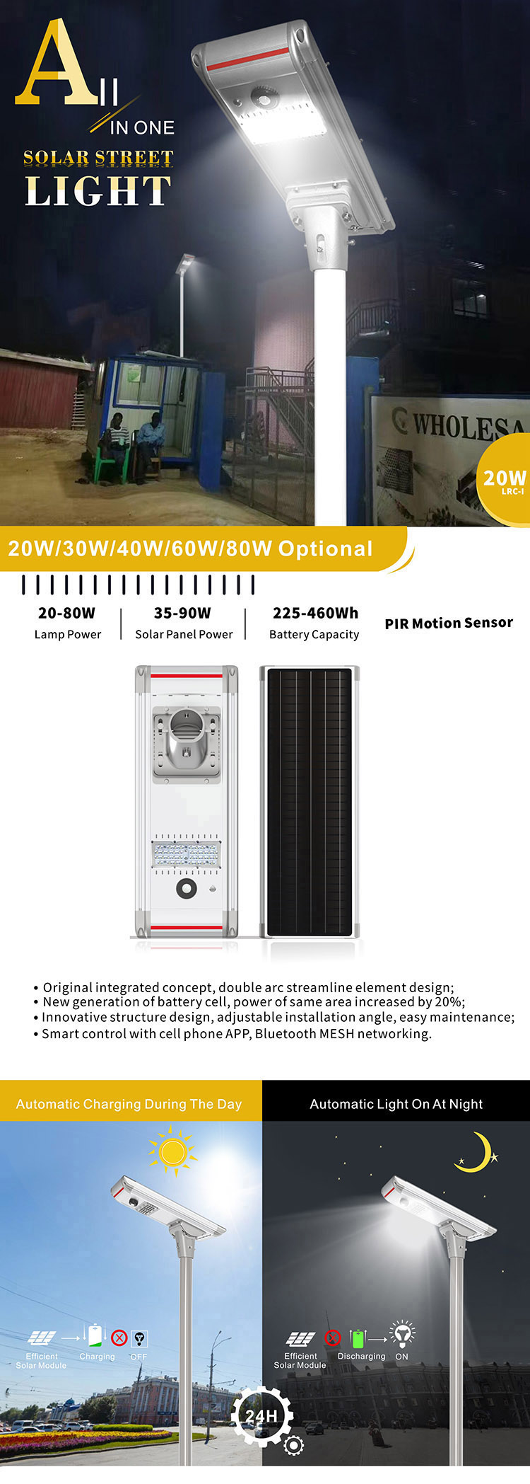 المنتجات الرائجة Ce Smart Control 3200Lm Lumens LED Square Waterproof 20w Lights Lamp All IN One Integrated Solar Street Light