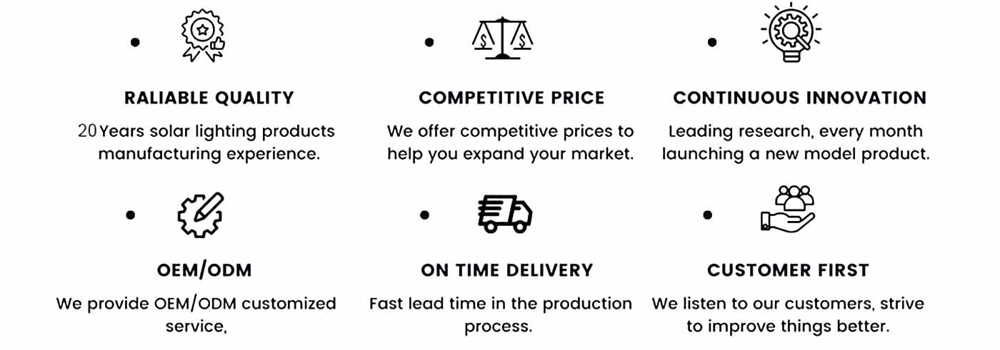 اختيار مصنع لإضاءة الشوارع بالطاقة الشمسية يعني اختيار شريك طويل الأمد يُقدّر موثوقية المنتج، وضمان التسليم، والخدمة المستمرة. بفضل خبرتنا التي تزيد عن 20 عامًا في صناعة الإضاءة الشمسية، بنينا ميزة تنافسية شاملة في مجالات التكنولوجيا، والإنتاج، ومراقبة الجودة، والخدمة، والتكيف مع التطبيقات.